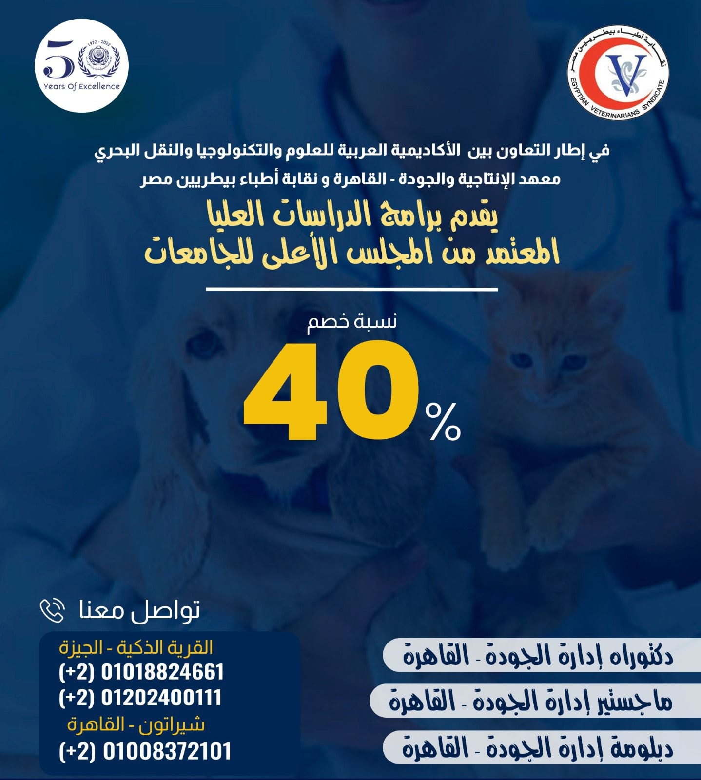 أعلن الدكتور خالد سليم نقيب البيطريين، أنه تم الاتفاق ببن نقابة البيطريين والأكاديمية العربية للعلوم والتكنولوجيا والنقل البحري لعمل تخفيضات للأطباء البيطريين، وتم بموجب هذا الاتفاق الحصول على خصم 40% لأعضاء النقابة العامة للأطباء البيطريين، ويتم فتح التسجيل في برامج الدراسات العليا المقدمة من معهد الإنتاجية والجودة - القاهرة التابع للأكاديمية لترم فبراير 2023.