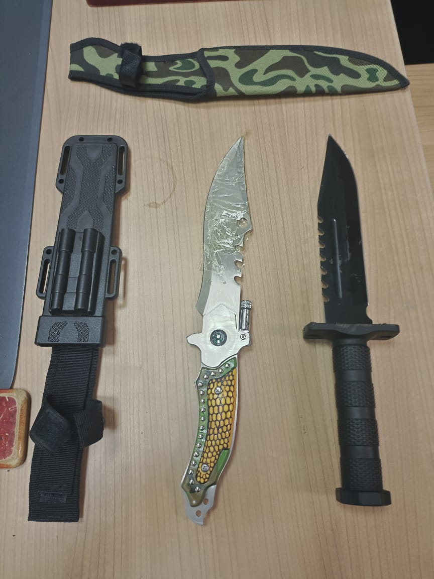 بتفتيش حقائب الراكب يدويًّا مما أسفر عن ضبط أسلحة بيضاء عبارة عن خنجرين لهما نصل بالجراب الخاص بهما أفاد تقرير إدارة الحماية المدنية بأنه محظور حيازتهما طبقًا للقانون السابق ذكره.
