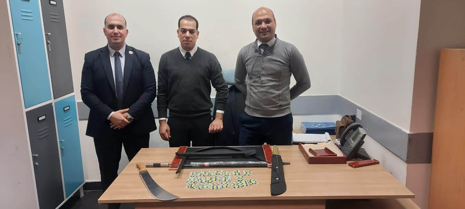 وبتفتيش حقائبه على جهاز الفحص بالأشعة بواسطة كل من محمد عزمي مأمور الجمرك ومحمود شحاته رئيس القسم واللذين تلاحظ لهما وجود أجسام معدنية داخل حقائب الراكب، قام ميلاد رسمي مدير الحركة المشرف على الصالة بتكليف عبد الله حمدي مأمور الجمرك بتفتيش حقائب الراكب يدويًّا مما أسفر عن ضبط ٣ سيوف لهم نصل معدني وكرباج أفاد تقرير ادارة الحماية المدنية بالمطار بأنه محظور حيازتهم طبقًا للقانون رقم ٣٩٤ لسنة ١٩٥٤ واستمرار التفتيش اليدوي بمعاونة محمود فتحي مأمور الجمرك تم ضبط ٢١ شريطًا لعقار الترامادول المخدر بإجمالي ٢١٠ كبسولات.