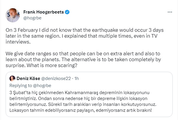 وهنا رد فرانك هوجربتس فقال: "في 3 فبراير لم أكن أعلم أن الزلزال سيحدث بعد 3 أيام في نفس المنطقة. شرحت ذلك عدة مرات، حتى في المقابلات التلفزيونية. نقدم نطاقات زمنية حتى يكون الناس في حالة تأهب إضافي وأيضًا للتعرف على الكواكب. البديل هو أن تؤخذ على حين غرة. وذلك يسبب الخوف أكثر؟"