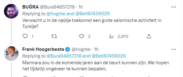 لكن الباحث الهولندي فرانك هوجربتس حدد منطقة في تركيا يمكن أن يضربها زلزال مدمر في الأيام المقبلة، وهي منطقة مرمرة، التي تقع شمال غرب تركيا، ويعيش فيها أكثر من 23 مليون نسمة.