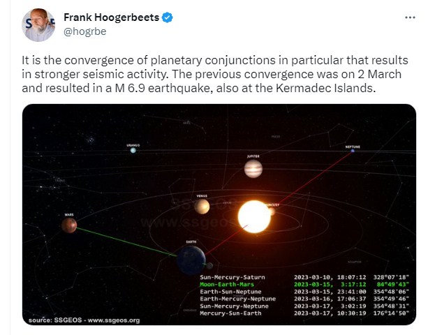 وقال الباحث الهولندي فرانك هوجربتس عن سبب زلزال مدمر في نيوزيلندا "إن تقارب اقترانات الكواكب على وجه الخصوص هو الذي ينتج عنه نشاط زلزالي قوى. والتقارب السابق كان في 2 مارس وتسبب في عن زلزال بقوة 6.9درجة بمقياس ريختر، وذلك في جزر كيرماديك النيوزيلندية".