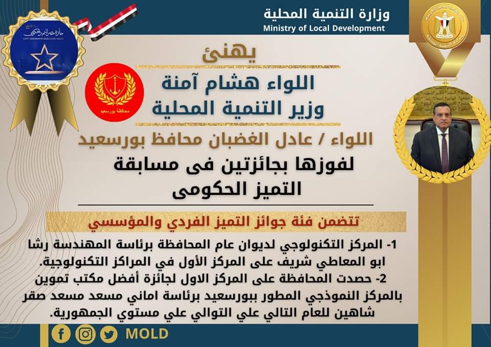 هنأ اللواء هشام ٱمنة وزير التنمية المحلية، اللواء عادل الغضبان محافظ بورسعيد، وذلك لفوز المحافظة بجائزتين في مسابقة التميز الحكومي التي تتضمن فئة جوائز التميز الفردي والمؤسسي.