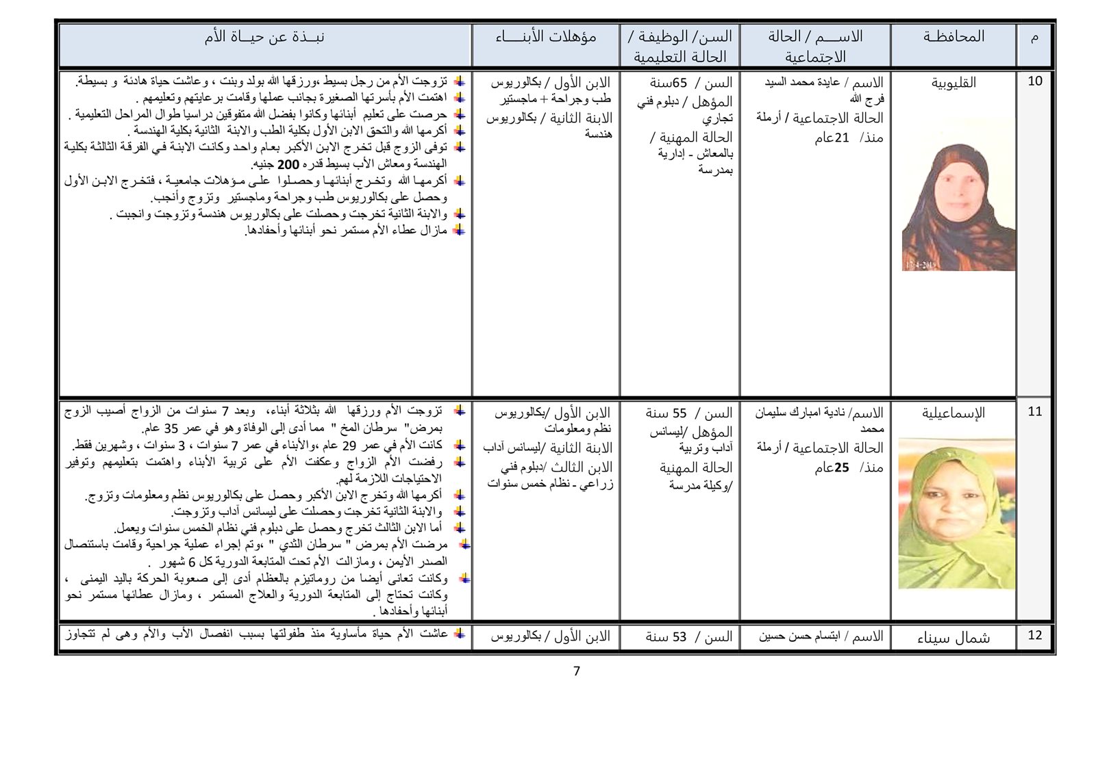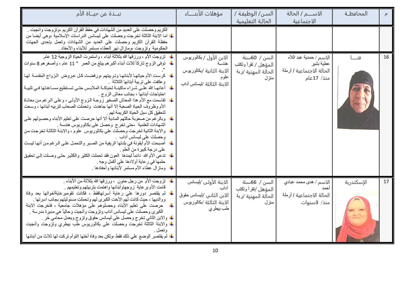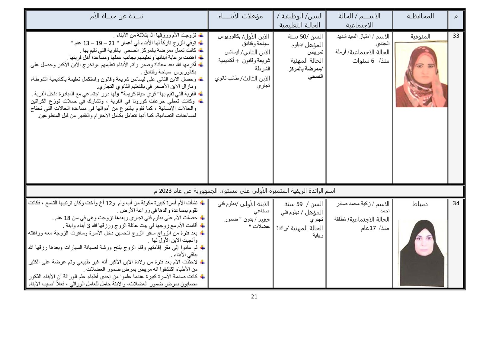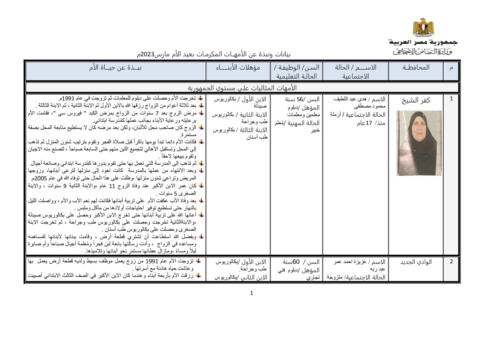 نشرت وزارة التضامن الاجتماعي تفاصيل قصص كفاح السيدات الفائزات في مسابقة الأمهات المثاليات 36 على مستوى الجمهورية.