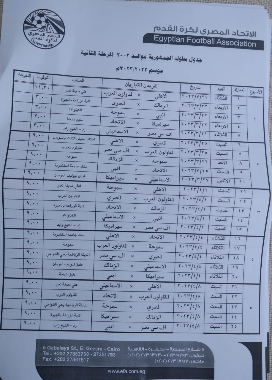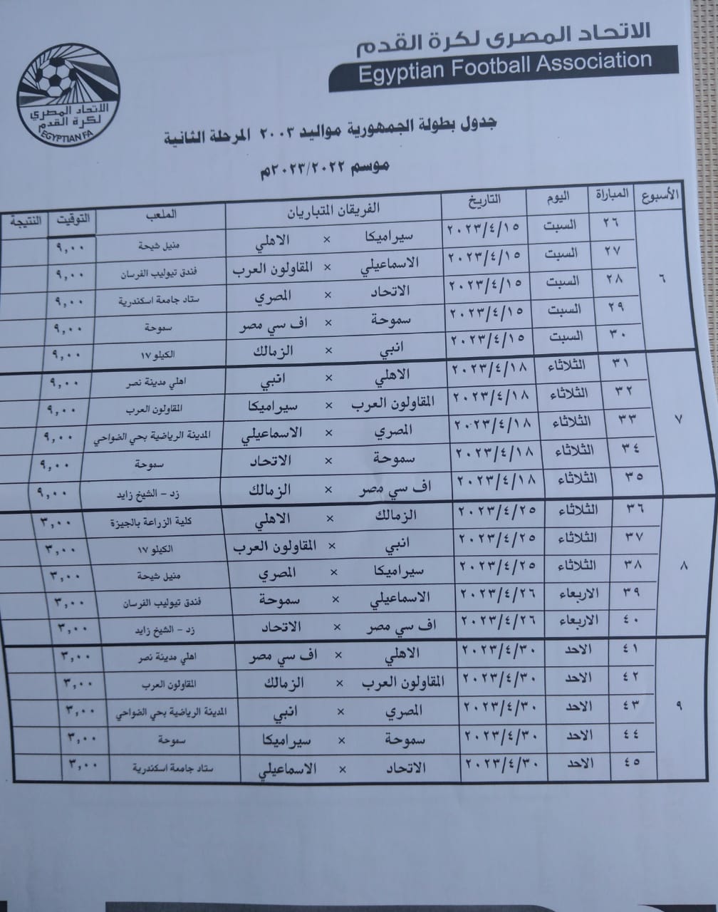 دوري الجمهورية للشباب،أعلن اتحاد الكرة اليوم الخميس جدول مباريات المرحلة الثانية لدوري الجمهورية للشباب 2003 للأندية المنافسة على اللقب.