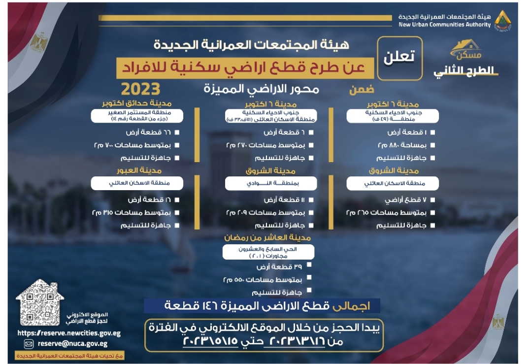 أراضي الإسكان، أعلنت وزارة الإسكان ممثلة في هيئة المجتمعات العمرانية الجديدة عن طرح قطع أراض سكنية للأفراد ضمن محور الأراضي المميزة لسنة 2023 بمشروع "مسكن" بالطرح الثاني.