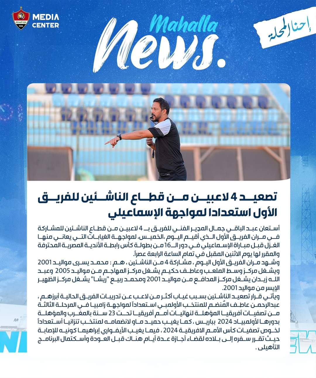 قرر عبد الباقي جمال المدير الفني لفريق غزل المحلة تصعيد 4 لاعبين من قطاع الناشئين بالنادي للمشاركة في مران الفريق الأول الذي أُقيم أمس الخميس، استعدادًا لمواجهة الإسماعيلي.