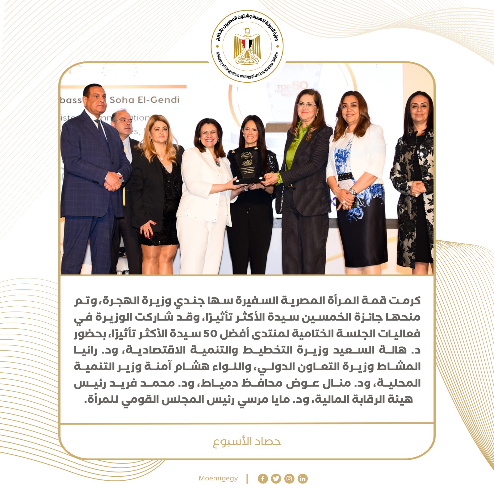 وكرمت قمة المرأة المصرية السفيرة سها جندي وزيرة الهجرة، وتم منحها جائزة الخمسين سيدة الأكثر تأثيرًا، وقد شاركت الوزيرة في فعاليات الجلسة الختامية لمنتدى أفضل 50 سيدة الأكثر تأثيرًا، بحضور هالة السعيد وزيرة التخطيط والتنمية الاقتصادية، ورانيا المشاط وزيرة التعاون الدولي، واللواء هشام آمنة وزير التنمية المحلية، ومنال عوض محافظ دمياط، ومحمد فريد رئيس هيئة الرقابة المالية، ومايا مرسي رئيس المجلس القومي للمرأة.