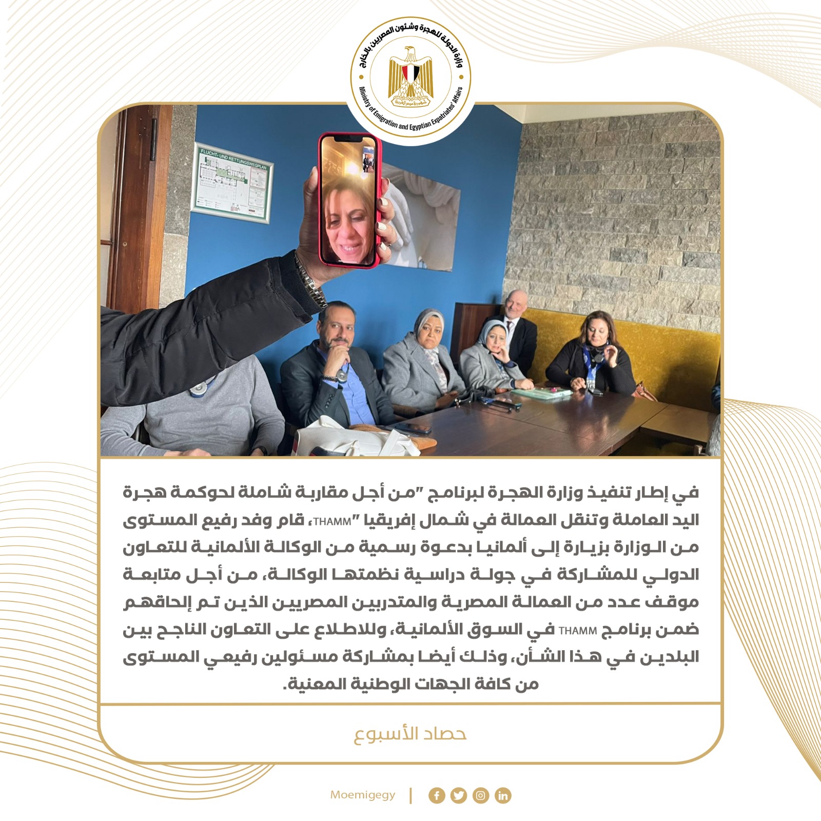 ويأتي ذلك في إطار تنفيذ وزارة الهجرة لبرنامج "من أجل مقاربة شاملة لحوكمة هجرة اليد العاملة وتنقل العمالة في شمال إفريقيا "THAMM، قام وفد رفيع المستوى من الوزارة بزيارة إلى ألمانيا بدعوة رسمية من الوكالة الألمانية للتعاون الدولي للمشاركة في جولة دراسية نظمتها الوكالة، من أجل متابعة موقف عدد من العمالة المصرية والمتدربين المصريين الذين تم إلحاقهم ضمن برنامج THAMM في السوق الألمانية، وللاطلاع على التعاون الناجح بين البلدين في هذا الشأن، وذلك أيضا بمشاركة مسئولين رفيعي المستوى من كافة الجهات الوطنية المعنية.