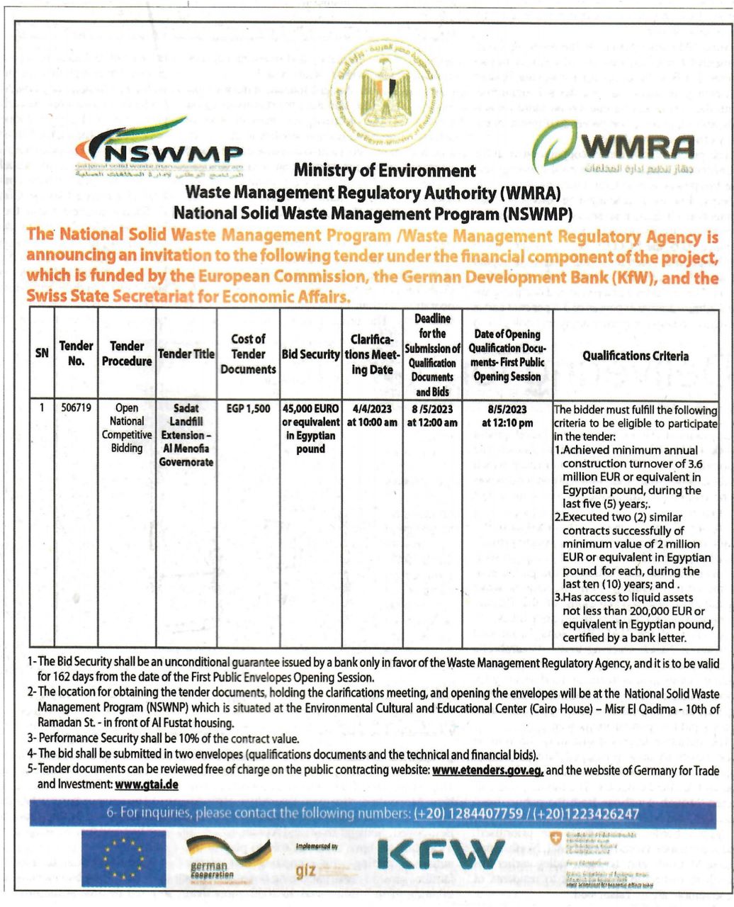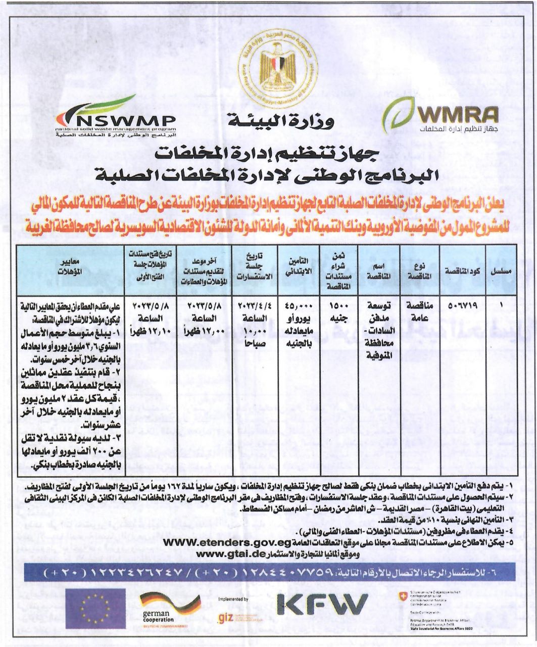أعلنت وزارة البيئة من خلال البرنامج الوطني لإدارة المخلفات الصلبة التابع لجهاز تنظيم إدارة المخلفات عن طرح مناقصة عامة بشأن إنشاء خلايا دفن جديدة بمدفن السادات التابع لمحافظة الغربية ضمن المكون الاستثماري للبرنامج وذلك فى إطار توجيهات الدكتورة ياسمين فؤاد وزيرة البيئة وفقا لخطة عمل البرنامج بالمحافظات الأربعة الواقعة في نطاق عمله (قنا/ اسيوط/الغربية / كفر الشيخ).