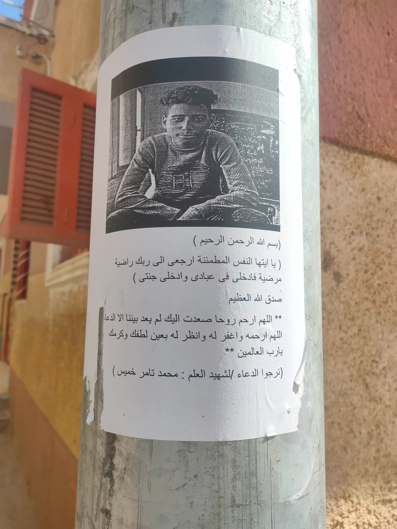 ووضع أصدقاء الطالب محمد تامر محمود صبحى خميس، صورته على أعمدة الإنارة بكافة أرجاء القرية ، وكذلك المساجد والمنازل مع مطالبة بالدعاء ، حيث كتبوا على الصورة "اللهم ارحم روحًا صعدت إليك ولم يعد بيننا إلا الدعاء.. اللهم ارحمه واغفر له وانظر له بعين لطفك وكرمك يارب العالمين".