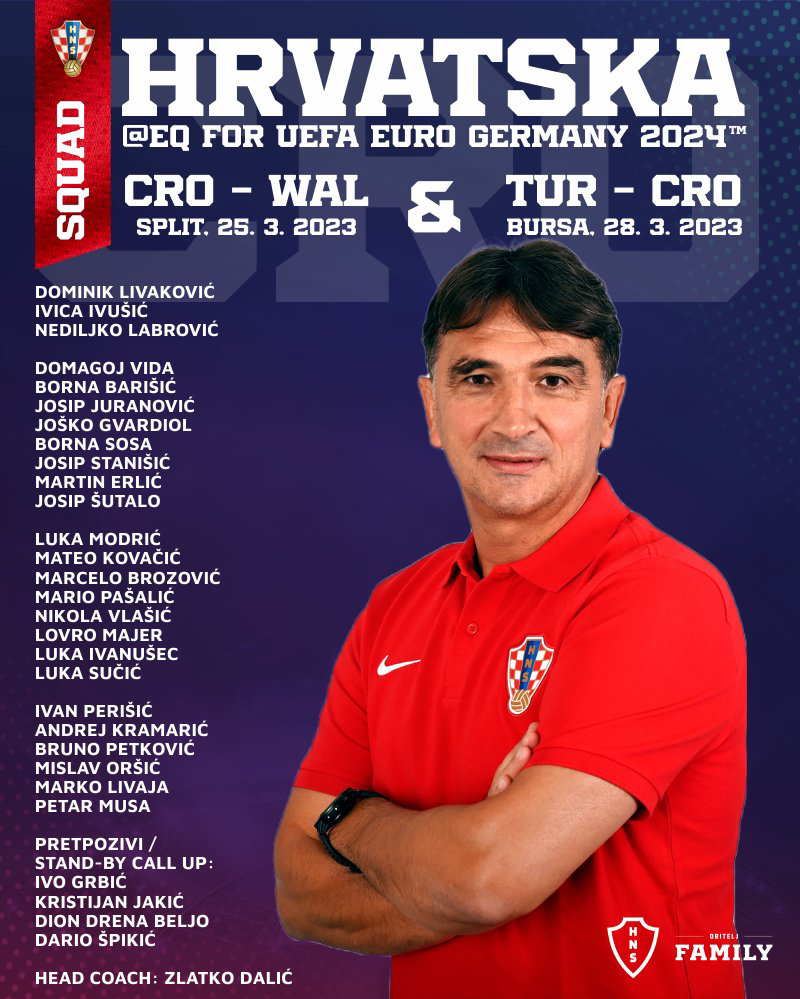 يورو 2024، أعلن زلاتكو داليتش المدير الفني لمنتخب كرواتيا، القائمة الرسمية لمواجهتي ويلز وتركيا، في إطار منافسات تصفيات كأس الأمم الأوروبية يورو 2024، والتي شهدت تواجد النجم الكرواتي لوكا مودريتش لاعب وسط ريال مدريد الإسباني.