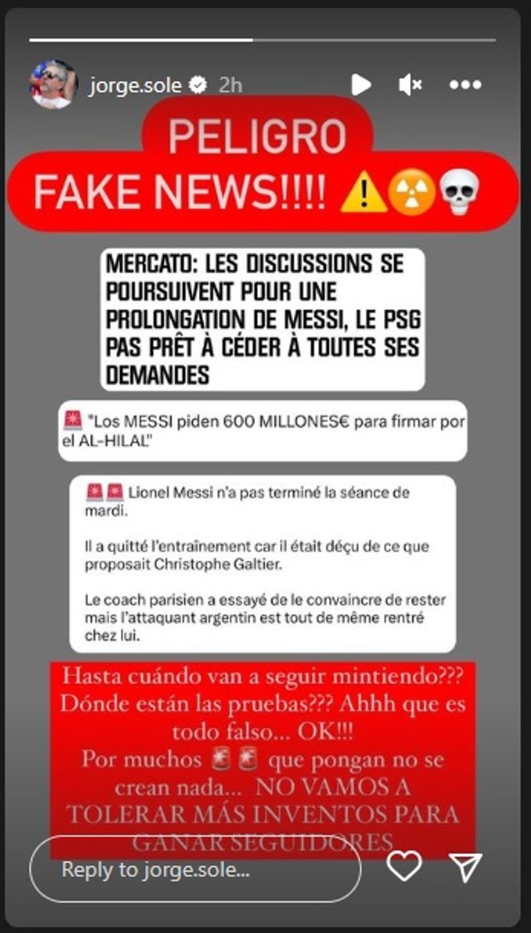 وكتب والد ميسي جملة واحدة للرد على هذه الأنباء، حيث قال: "الأخبار الكاذبة، لا تثقوا بهم، لن نقبل الأكاذيب بعد الآن".