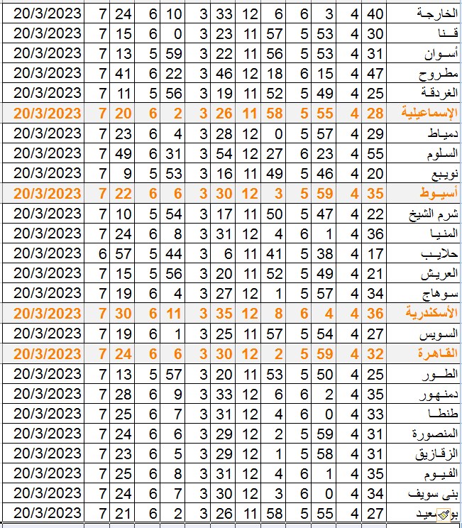 مواقيت الصلاة اليوم وفقًا للتوقيت المحلي لمدينتي القاهرة والإسكندرية وعدد من مدن ومحافظات الجمهورية من واقع بيانات الهيئة العامة للمساحة