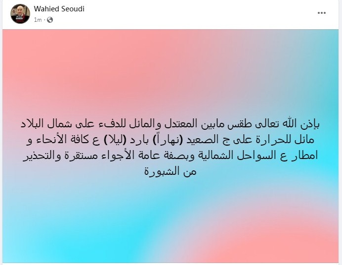 وعن حالة الطقس في الأيام المقبلة، كتب وحيد سعودي تدوينة على الفيس بوك، كشف فيها عن حالة الطقس وأماكن سقوط الأمطار فقال: "بإذن الله تعالى طقس ما بين المعتدل والمائل للدفء على شمال البلاد مائل للحرارة على ج الصعيد (نهارًا) بارد (ليلا) على كافة الأنحاء وأمطار ع السواحل الشمالية وبصفة عامة الأجواء مستقرة والتحذير من الشبورة"