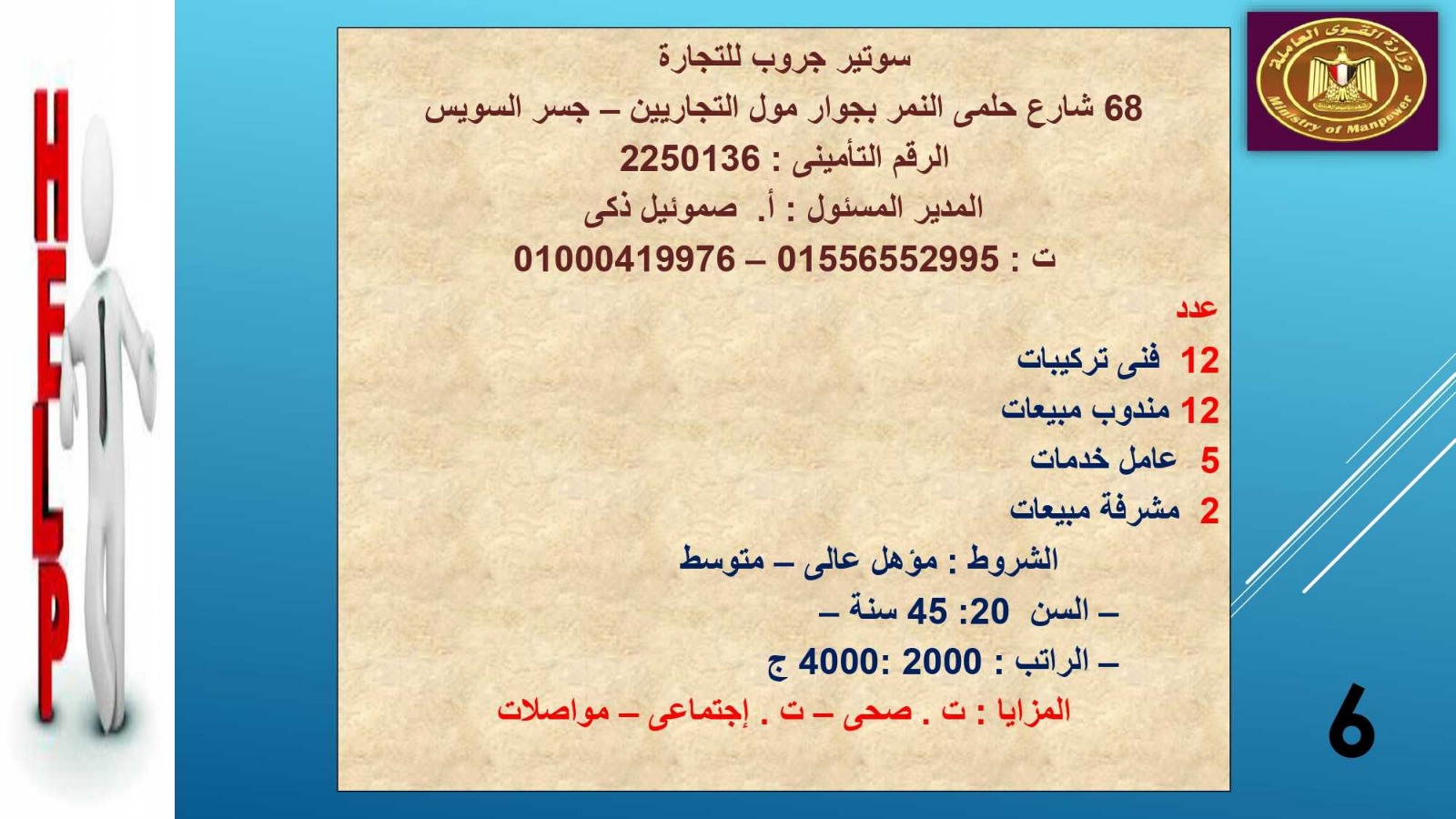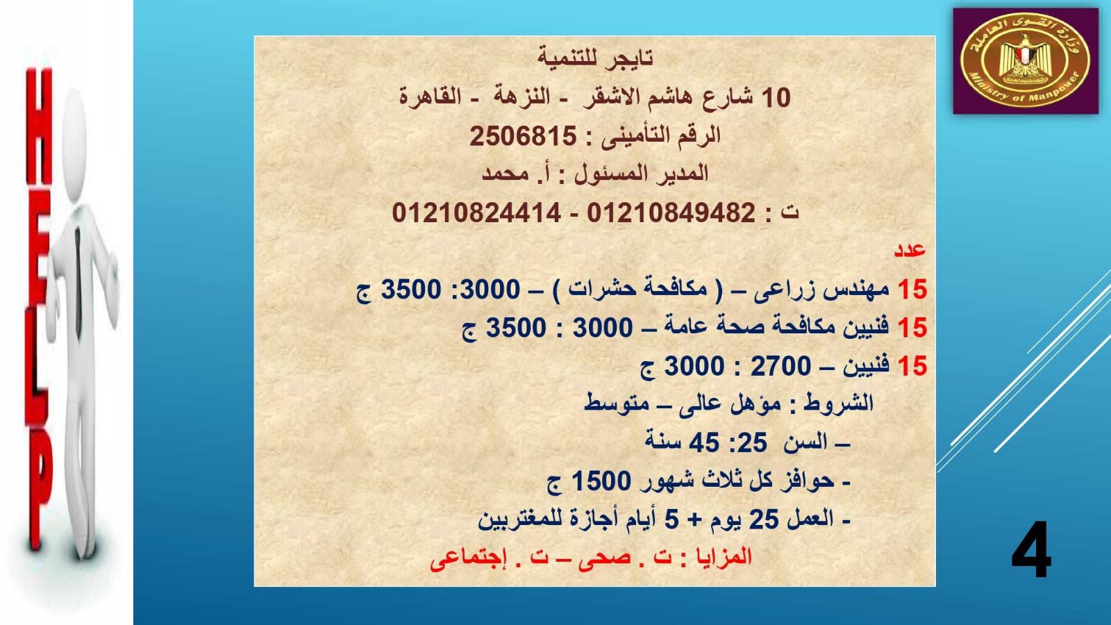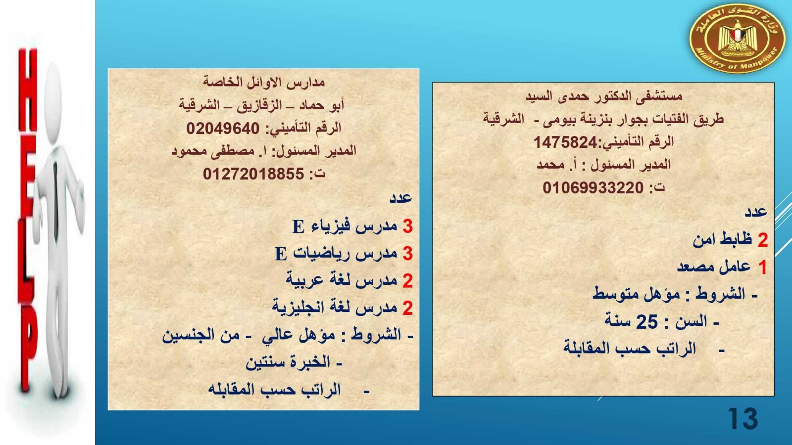 وأعلنت القوى العاملة عن فرص عمل جديدة متوفرة في 11 محافظة، هي: القاهرة، وبورسعيد، وأسيوط، والإسكندرية، والغربية، والمنوفية، والشرقية، والإسماعيلية، وأسيوط، والدقهلية، وجنوب سيناء في التخصصات الاتية: مهندسين زراعة وميكانيكا وكهرباء ونسيج، ومحاسبين، ومدرسين فيزياء وأحياء ورياضيات ولغة عربية وإنجليزية، ومندوبين مبيعات، وشؤون عاملين، ومشرفين جودة، وفنيين جميع التخصصات، وعمال إنتاج، وأفراد أمن بمواقع مميزة، وأخصائيين تمويل، ومعلمين سباحة، ومترجمين لغة صينية، ومحاضرين برمجة وحاسب آلي ولغة ألمانية، وكافة التخصصات الفندقية، ومهن التفصيل والخياطة، وسائقين، وعمال نظافة وتجميع وخدمات،وتخصصات أخرى.