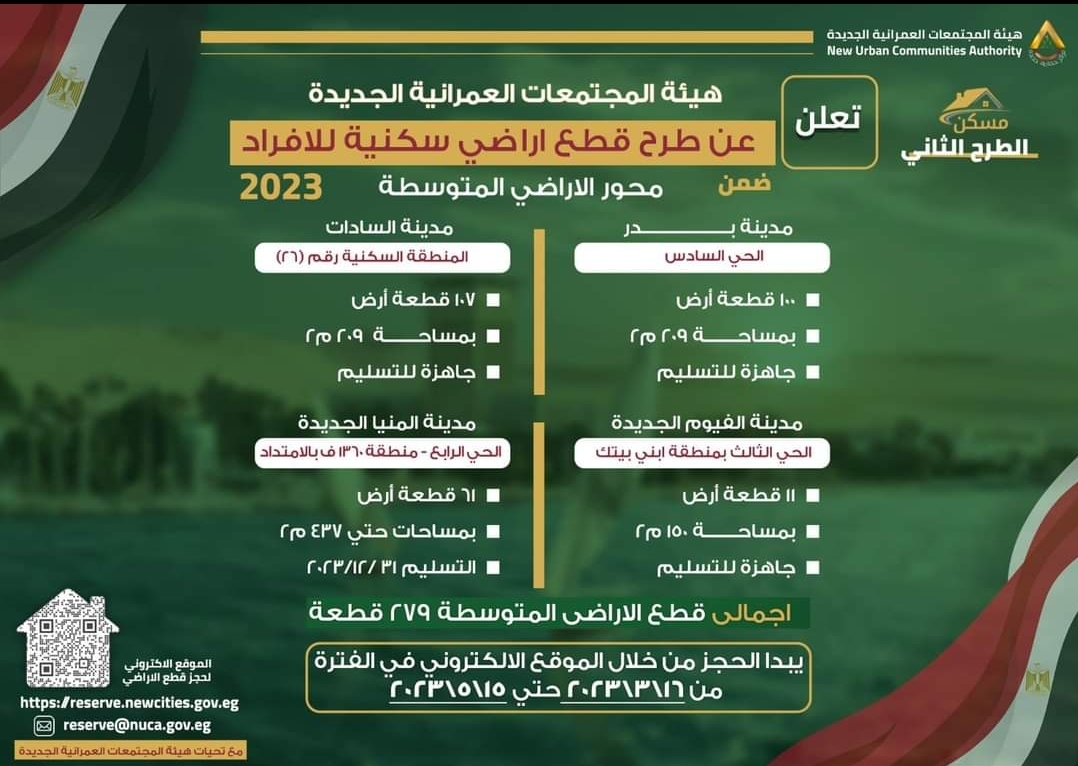 أعلنت هيئة المجتمعات العمرانية عن طرح قطع أراض سكنية للأفراد ضمن محور الأراضي المتوسطة بمدينة بدر ومدينة السادات ومدينة الفيوم الجديدة ومدينة المنيا الجديدة ليصل إجمالي قطع الأراضي المتوسطة إلى 279 قطعة.