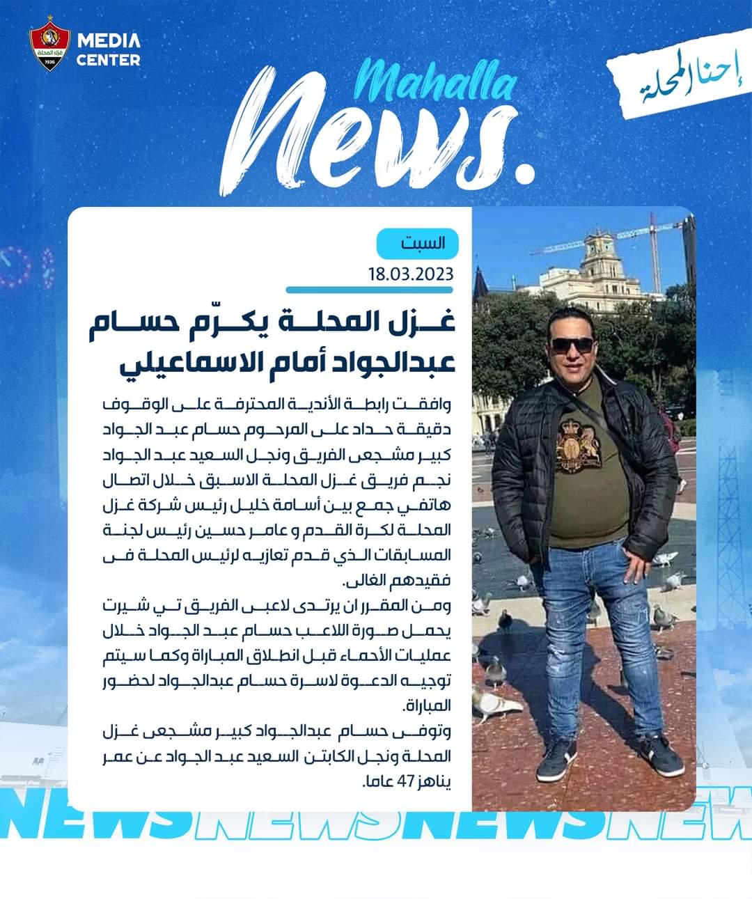 وتوفي حسام عبدالجواد كبير مشجعي غزل المحلة ونجل الكابتن السعيد عبد الجواد عن عمر يناهز 47 عاما.