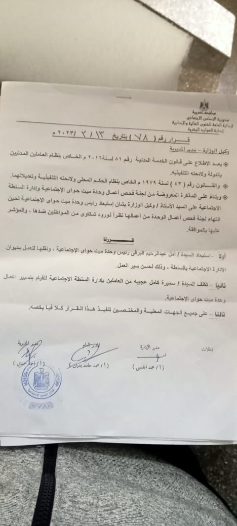 قرر أحمد حمدي مدير مديرية التضامن الاجتماعي بالغربية استبعاد رئيس وحدة ميت حواي الاجتماعية من منصبها ونقلها إلى العمل بديوان الإدارة الاجتماعية بالسنطة وذلك لحين فحص الشكاوى المقدمة ضدها من الأهالي.