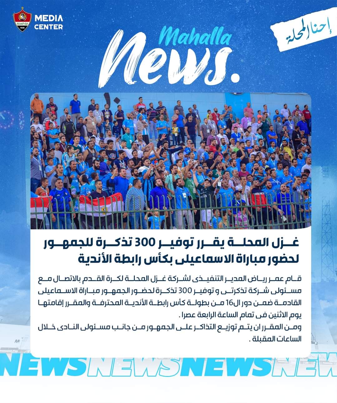 أجرى عمر رياض المدير التنفيذي لشركة غزل المحلة لكرة القدم اتصالا مع مسئولي شركة تذكرتي من أجل توفير 300 تذكرة لحضور الجمهور مباراة الإسماعيلي القادمة ضمن دور الـ16 من بطولة كأس رابطة الأندية المحترفة والمقرر إقامتها يوم الاثنين في تمام الساعة الرابعة عصرا.