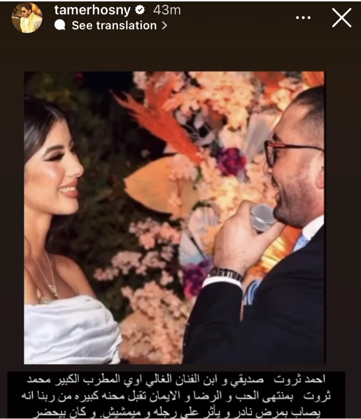 ونشر تامر مقطع فيديو لأحمد ثروت عبر انستجرام وعلق على الفيديو: "أحمد ثروت صديقي وابن الفنان الغالي أوي المطرب الكبير محمد ثروت بمنتهي الحب والرضا والإيمان تقبل محنة كبيرة من ربنا أنه يصاب بمرض نادر يأثر على رجله وميمشيش، وكان بيحضر لزواجه، وفي كلامي معاه قولتله أنا كنت بكلمك أهون عليك والحقيقة لاقيته مش محتاج وهو من إيمانه بقضاء ربنا مهون على نفسه ونفسيته في أعلى درجات الرضا بيهزر ومبسوط، قولتله بأيدك تحول المحنة لمنحة وقالي أنا بعمل كده دلوقتي وفاهم الاختبار كويس وهنجح فيه وهخف وهمشي تاني على رجلي.