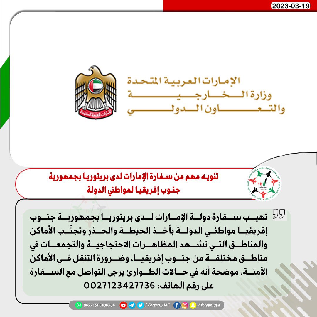 أهابت سفارة الإمارات في بريتويا بـ جنوب إفريقيا بمواطني دولة الإمارات إلى أخذ الحيطة والحذر، وتجنب الأماكن والمناطق التي تشهد التظاهرات الاحتجاجية والتجمعات في مناطق مختلفة من جنوب إفريقيا.