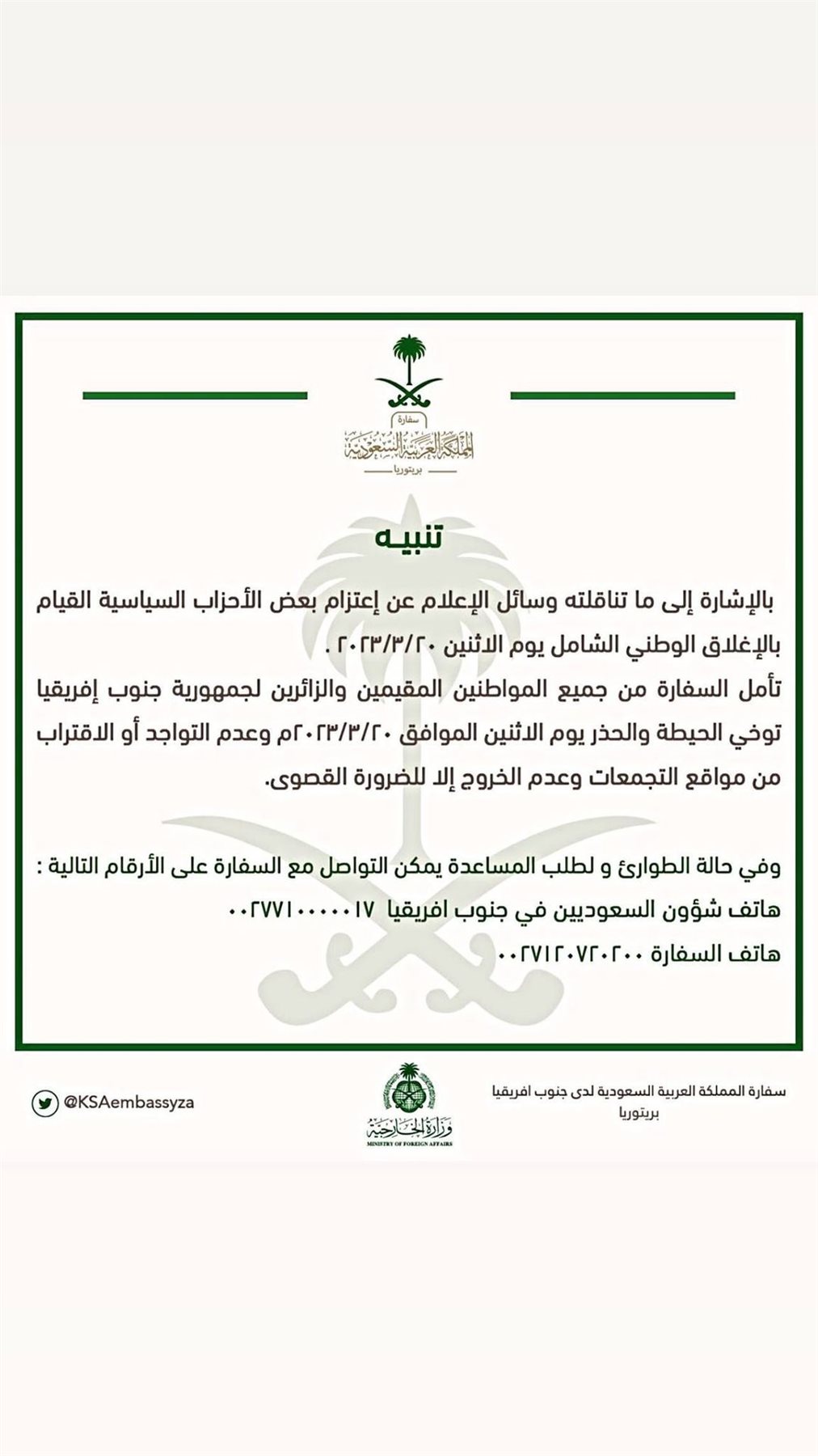 من جانبها، قالت السفارة السعودية في جنوب إفريقيا: "بالإشارة إلى ما تناقلته وسائل الإعلام عن اعتزام بعض الأحزاب السياسية القيام بالإغلاق الوطني الشامل يوم الاثنين 20/3/2023، تأمل السفارة من جميع المواطنين المقيمين والزائرين لجمهورية جنوب إفريقيا توخي الحيطة والحذر وعدم التواجد أو الاقتراب من مواقع التجمعات وعدم الخروج إلا للضرورة القصوى".