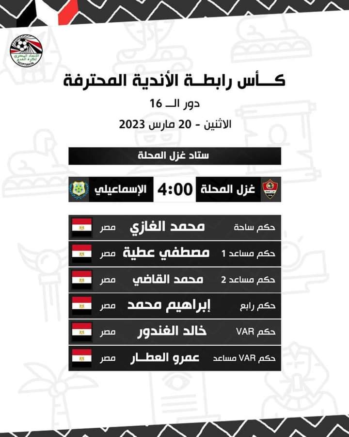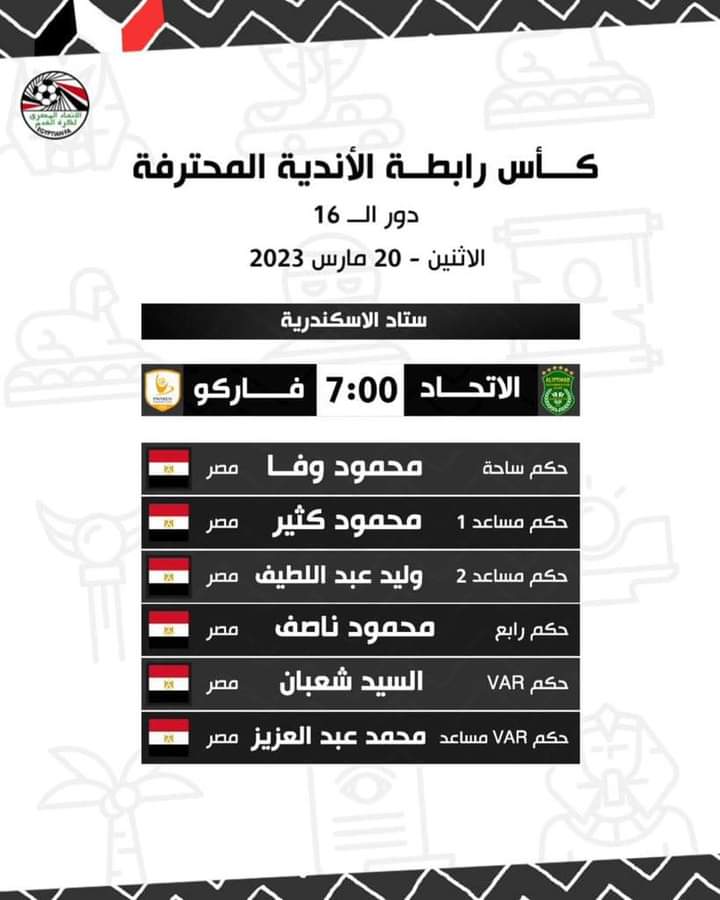 كأس الرابطة، أعلنت لجنة الحكام اتحاد الكرة أسماء حكام مباريات اليوم الإثنين في دور ال16 ببطولة كأس رابطة الأندية وجاءت على على النحو التالي: