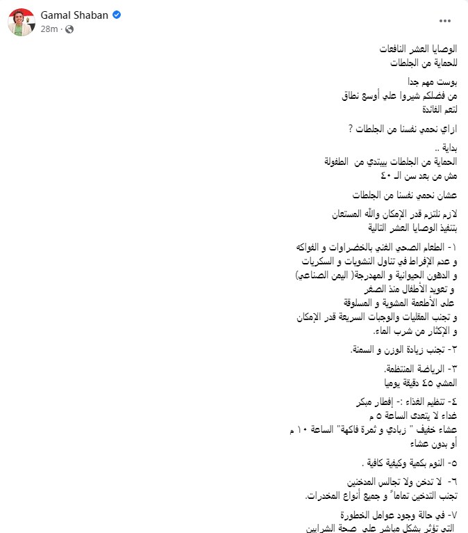 وكتب الدكتور جمال شعبان تدوينة، عبر الفيس بوك، عن الوقاية من الجلطات فقال: "الوصايا العشر النافعات للحماية من الجلطات... بداية الحماية من الجلطات بيبتدي من الطفولة مش من بعد سن الـ ٤٠، عشان نحمي نفسنا من الجلطات لازم نلتزم قدر الإمكان والله المستعان بتنفيذ الوصايا العشر التالية".