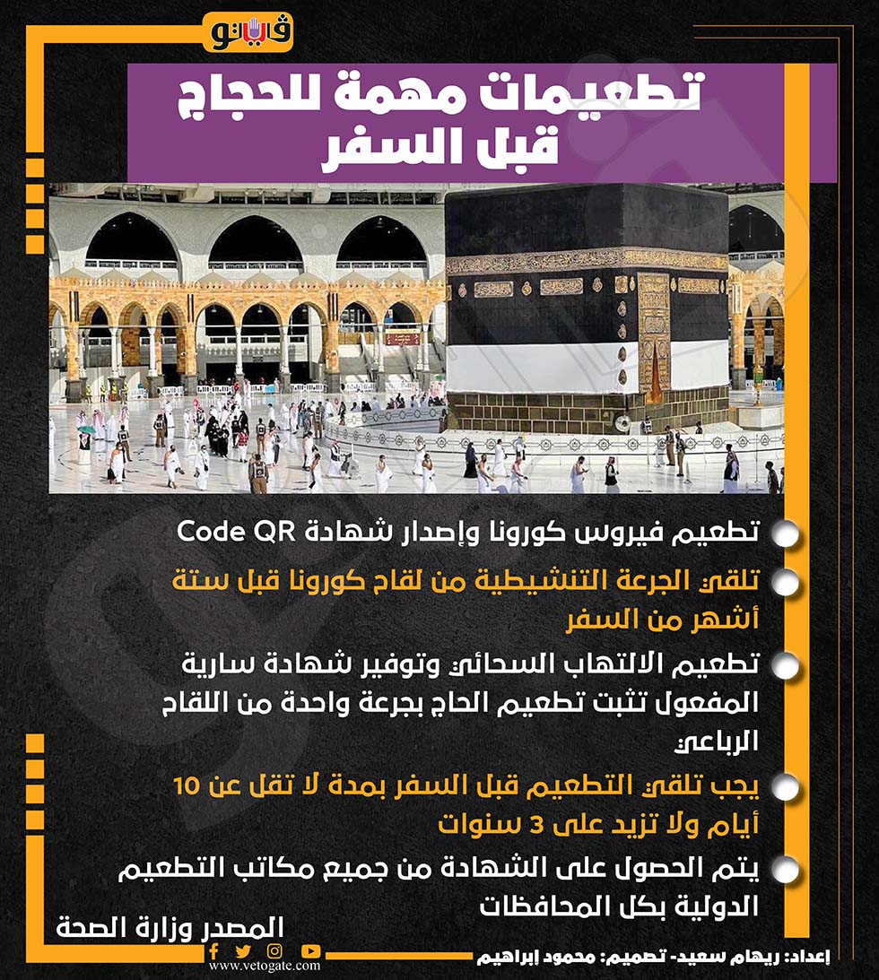 تطعيمات مهمة للحجاج قبل السفر (انفوجراف) الثلاثاء 21/مارس/2023 - 11:29 م 3/21/2023 11:29:39 PM شهادة تطعيم فيروس كورونا ريهام سعيد شارك طباعة 18 حجم الخط شارك طباعة Code QR الجرعة التنشيطية الالتهاب السحائي محافظات الجمهورية وزارة الصحة موسم الحج