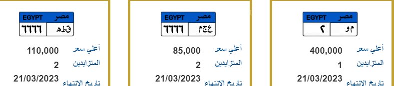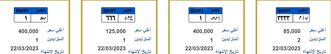 كما طرحت لوحات "أ س س 1" بقيمة 400 ألف جنيه، "ع م د 666" بقيمة 125 ألف جنيه، "ق ط ه 6666" بقيمة 110 ألف جنيه، "ع ج م 6666" بقيمة 85 ألف جنيه، "م و2" بقيمة 400 ألف جنيه، "ب ه 1" بـ 400 ألف جنيه.