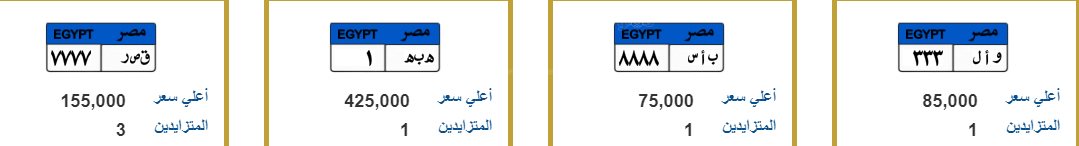 كما طرحت لوحات معدنية، "ق ص ر 7777" بقيمة 155 ألفًا، "ه ب ه 1" بقيمة 425 ألف جنيه، "ب أ س 8888" بقيمة 75 ألف جنيه، "و أ ل 333" بقيمة 85 ألف جنيه.