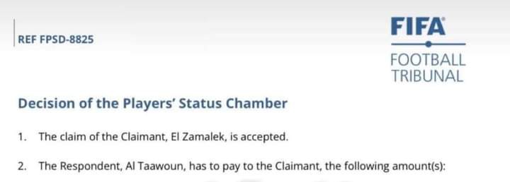 قررت غرفة فض المنازعات في الاتحاد الدولي لكرة القدم فيفا الحكم لصالح نادي الزمالك في قضية مستحقاته لدي التعاون السعودي في صفقة بيع مصطفي فتحي.