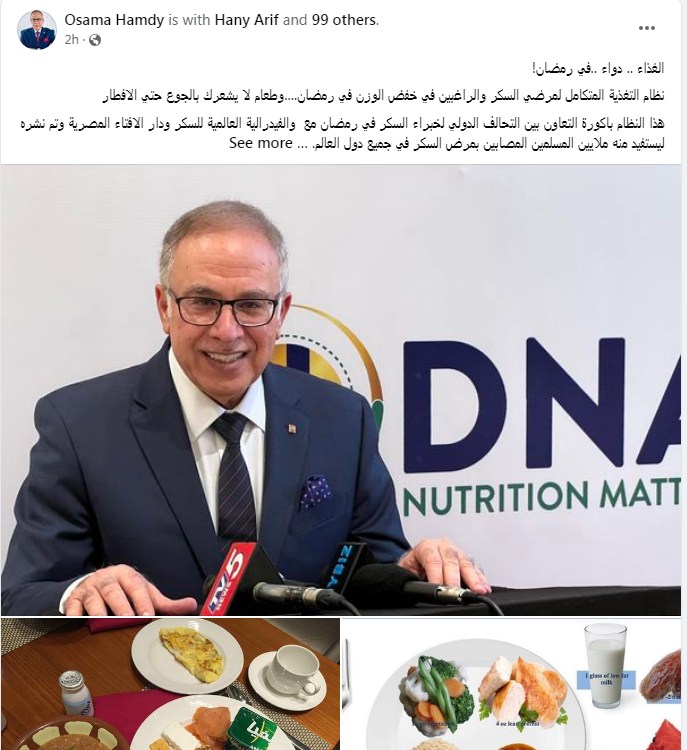 مرضى السكر في رمضان، قدم الدكتور أسامة حمدي، أستاذ السكر والباطنة بجامعة هارفارد، روشتة لمرضى السكر في رمضان، كشف فيها عن النظام الغذائي المتكامل لمرضى السكر في الشهر الكريم، وللراغبين في خفض وزنهم.