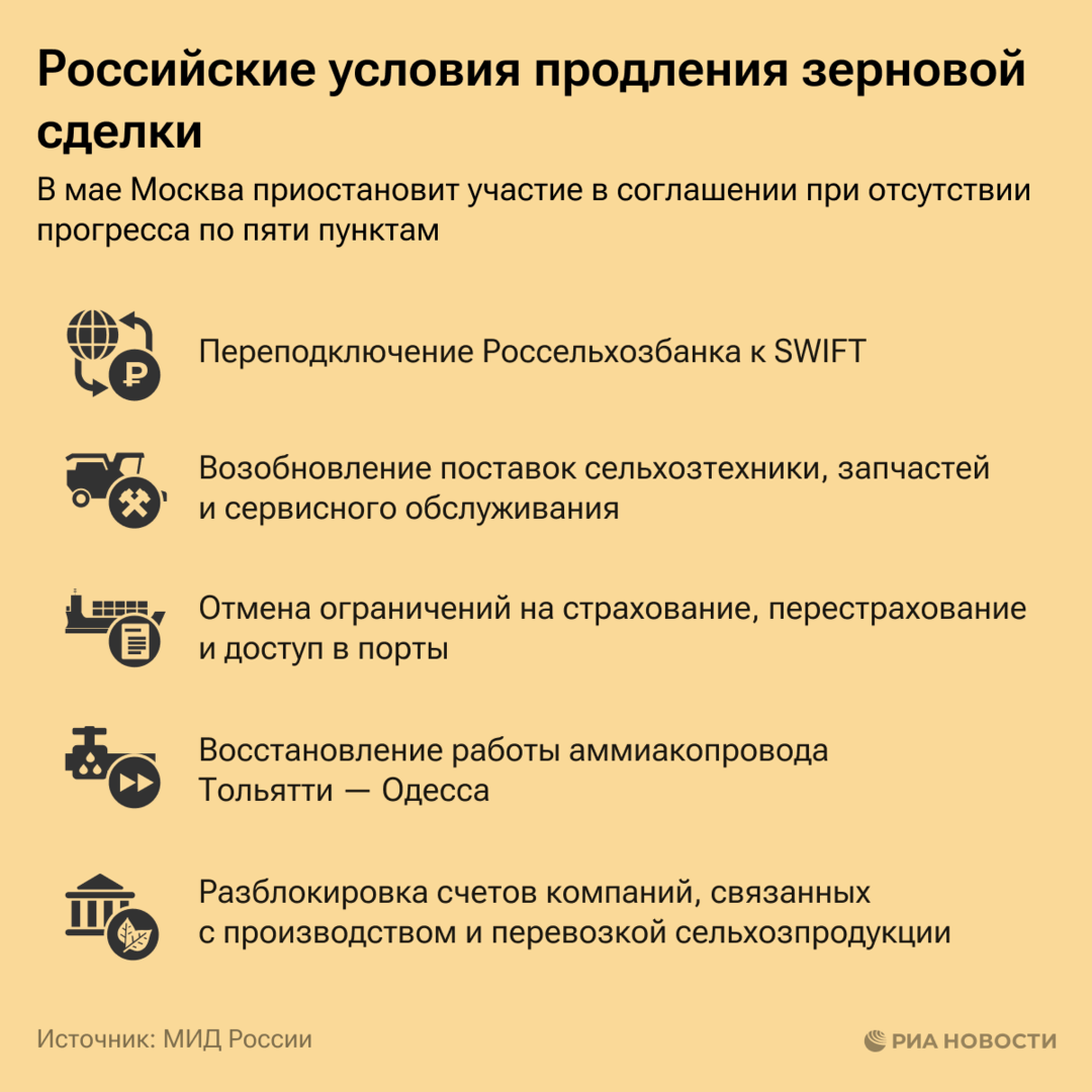 وأشارت الوزارة إلى 5 شروط أساسية لا بد من استيفائها قبل الـ 18 من مايو، حتى توافق روسيا على تمديد صفقة الحبوب، مرة إضافية، وهي: إعادة ربط نظام البنوك الروسي "روسلخوزبانك "،Rosselkhozbank مع نظام سويفت، واستئناف توريد إمدادات الآلات الزراعية وقطع الغيار والصيانة، وإلغاء القيود المفروضة على التأمين وإعادة التأمين، ورفع الحظر المفروض على الوصول إلى الموانئ، وإعادة ترميم خط أنابيب الأمونيا "تولياتي" أوديسا واستئناف العمل به، ورفع الحظر عن الأصول الأجنبية وحسابات الشركات الروسية المتعلقة بإنتاج ونقل المواد الغذائية والأسمدة.
