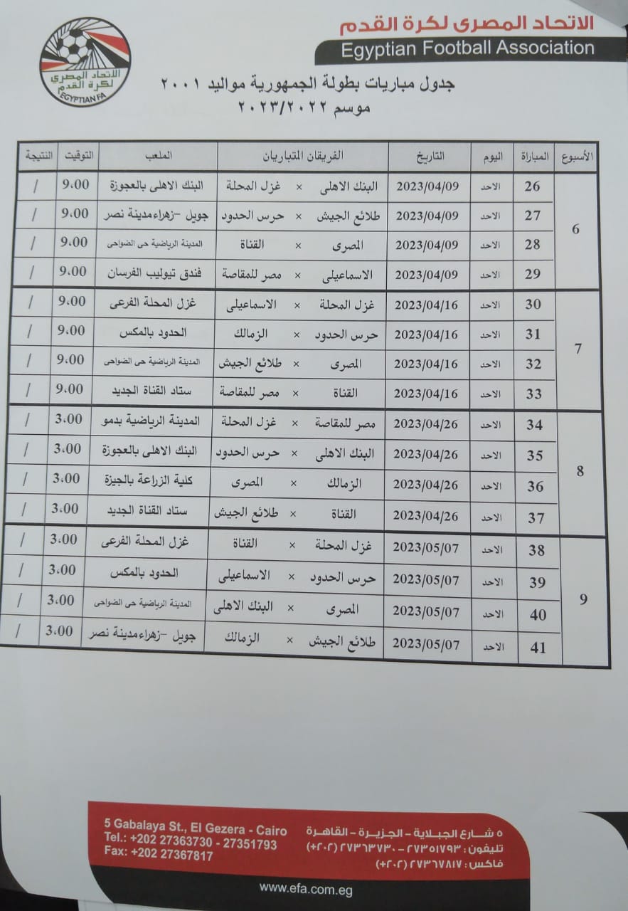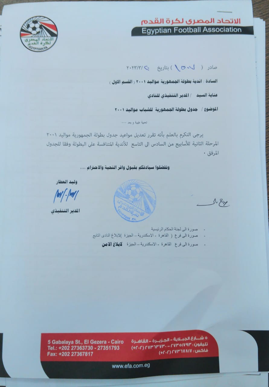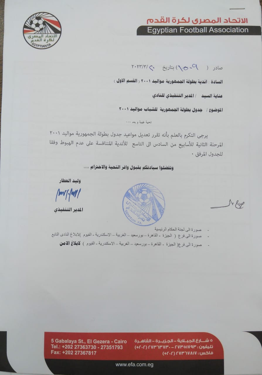 وأكد اتحاد الكرة أنه يسمح بمشاركة حارس مرمى مقيد بالفريق الأول في بطولة الجمهورية للشباب مواليد 2001، والسماح بجلوس 9 لاعبين على مقاعد البدلاء و9 أفراد من الجهاز على دكة البدلاء.