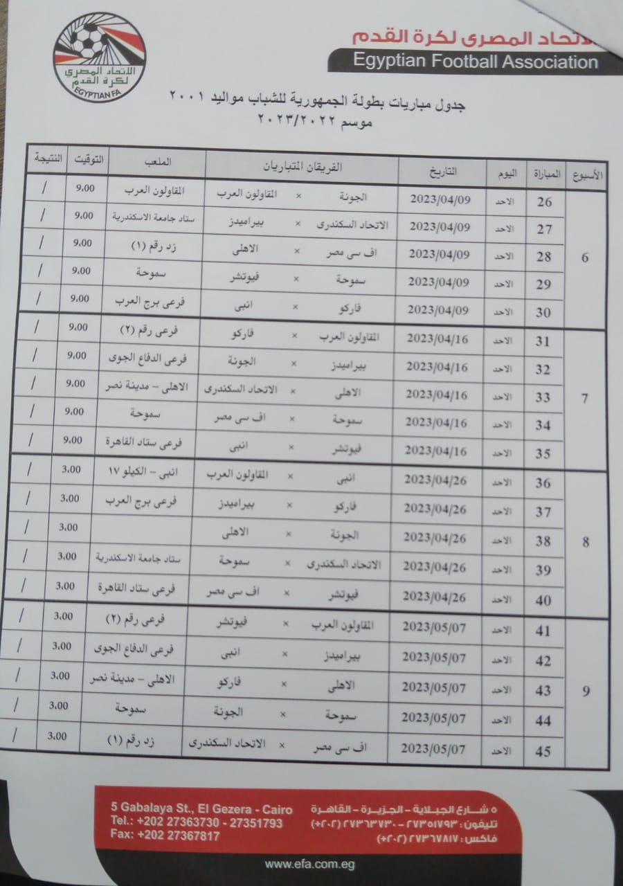 كما يسمح بتأجيل مباريات دوري الجمهورية للناشئين والشباب حال وجود عدد ثلاثة لاعبين فأكثر بالمنتخبات الوطنية للناشئين والشباب.