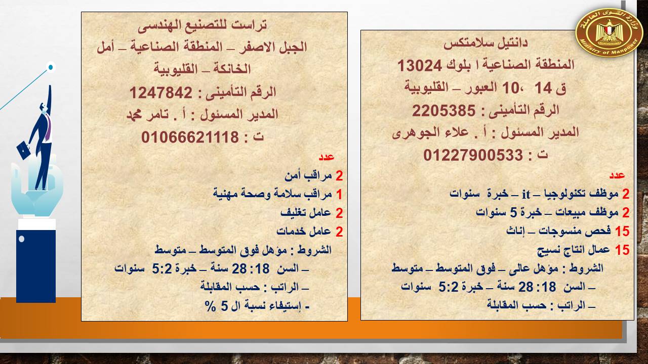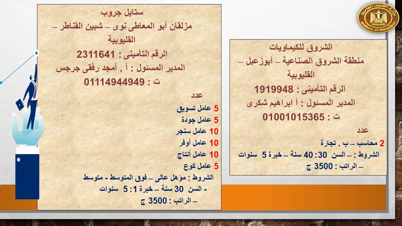 أعلنت وزارة القوى العاملة عن توفير 127 فرصة عمل للشباب من الجنسين منها لذوى همم، بمحافظة القليوبية، للعمل فى 6 شركات من القطاع الخاص والاستثماري، لحملة المؤهلات العليا والمتوسطة وفوق المتوسط وبدون مؤهل، برواتب مجزية، ومزايا أخرى.