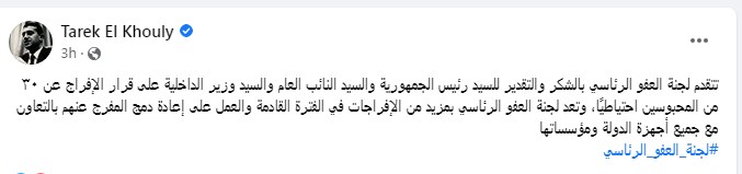وعن قائمة العفو الرئاسي كتب النائب طارق الخولي تدوينة على الفيس بوك: "تتقدم لجنة العفو الرئاسي بالشكر والتقدير للسيد رئيس الجمهورية والسيد النائب العام والسيد وزير الداخلية على قرار الإفراج عن ٣٠ من المحبوسين احتياطيًا، وتعد لجنة العفو الرئاسي بمزيد من الإفراجات في الفترة القادمة والعمل على إعادة دمج المفرج عنهم بالتعاون مع جميع أجهزة الدولة ومؤسساتها #لجنة_العفو_الرئاسي".