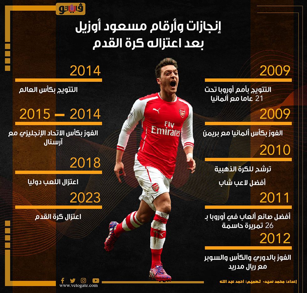 إنجازات وأرقام مسعود أوزيل بعد اعتزاله كرة القدم (إنفوجراف) الأربعاء 22/مارس/2023 - 06:25 م 3/22/2023 6:25:04 PM مسعود أوزيل، فيتو محمد سيد شارك طباعة 18 حجم الخط شارك طباعة مسعود أوزيل ريال مدريد ألمانيا أرسنال بريمن