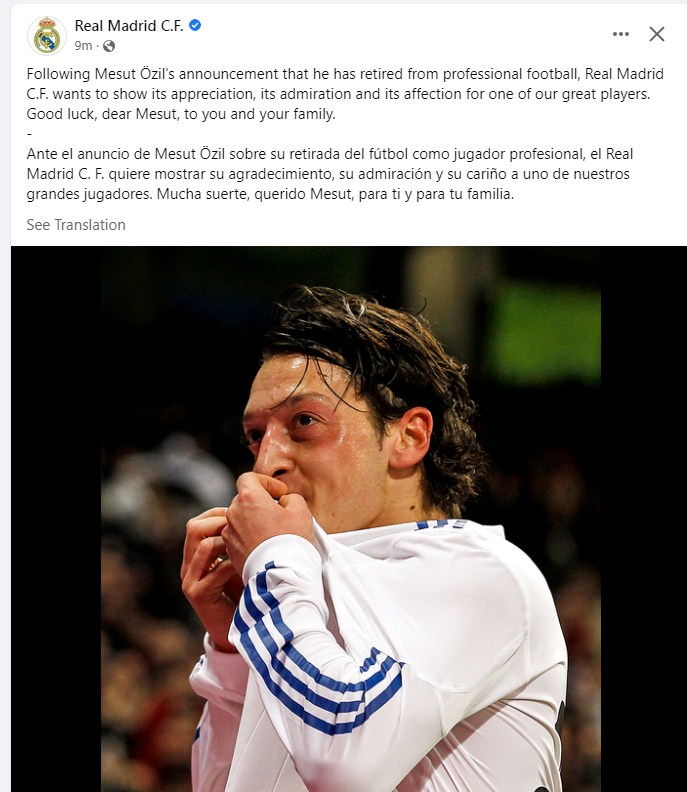 وعن اعتزال مسعود أوزيل كتب نادي ريال مدريد رسالة للاعب المعتزل أوزيل، عبر حسابه الرسمي بالفيس بوك، قال فيها: "بعد إعلان مسعود أوزيل اعتزاله كرة القدم الاحترافية، نادي ريال مدريد يريد أن يُظهر تقديره وإعجابه وعاطفته لأحد لاعبينا الكبار. حظًا سعيدًا عزيزي مسعود لك ولعائلتك."
