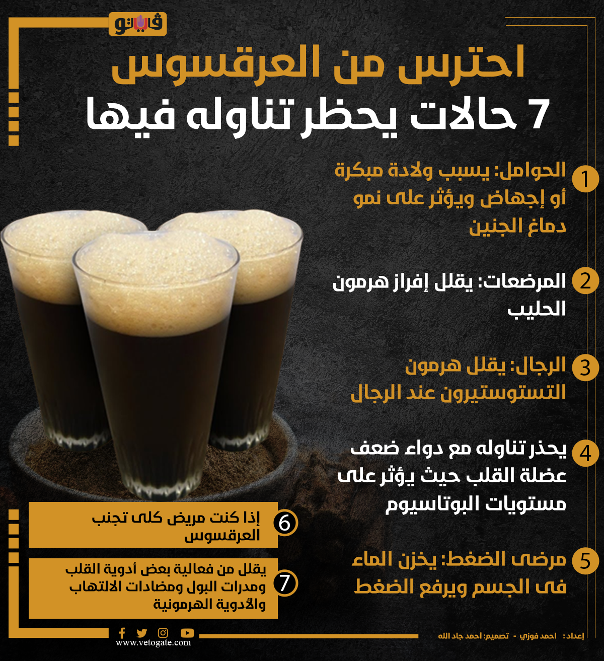 .. احترس من العرقسوس، 7 حالات يحظر تناوله فيها (إنفوجراف) الخميس 23/مارس/2023 - 12:46 م 3/23/2023 12:46:02 PM العرقسوس، فيتو آية مصطفى شارك طباعة 18 حجم الخط شارك طباعة العرقسوس هرمون الحليب هرمون التستوستيرون ضعف عضلة القلب مرضي السكر مدرات البول عضلة القلب انفوجراف