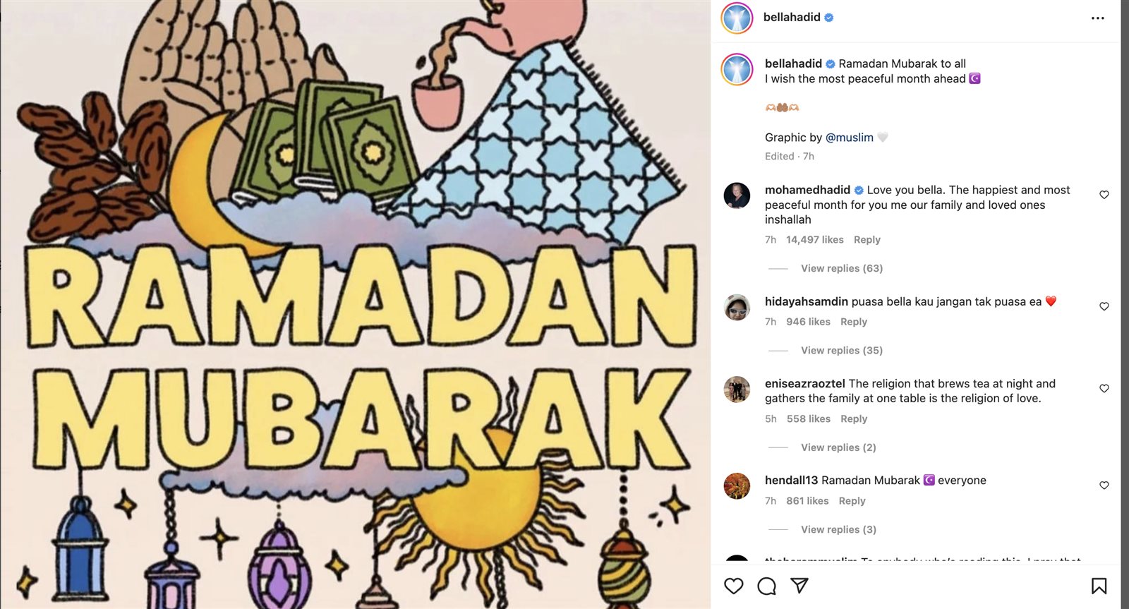 بيلا حديد، كعادتها كل عام حرصت عارضة الأزياء العالمية، على تهنئة المسلمين بحلول شهر رمضان، عبر نشرها صورة على حسابها الرسمي على موقع تبادل الصور والفيديوهات “انستجرام”، تحمل جملة “رمضان مبارك”، وأرفقتها بتعليق تمنت فيه، أن يكون شهر رمضان مليئا بالسلام.