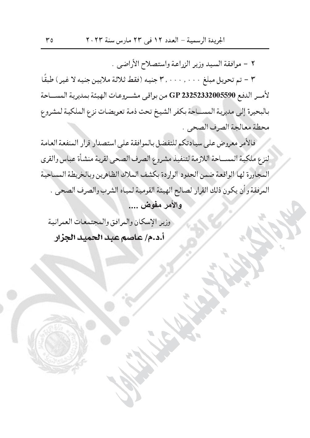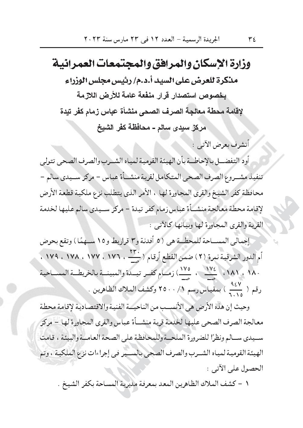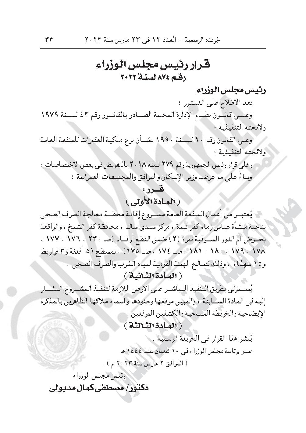 -قرار رئيس الوزراء رقم 874 لسنة 2023، باعتبار مشروع إقامة محطة معالجة الصرف الصحى بناحية منشأة عباس زمام كفر تيدة، مركز سيدى سالم، محافظة كفر الشيخ، والواقعة بحوض أم الدور الشرقية نمرة (2) ضمن القطع أرقام (ص ـ 230، 176، 177، 178، 179، 180، 181، ص ـ 174، ص ـ 175) بمسطح (5 أفدنة و3 قراريط و15 سهمًا)، وذلك لصالح الهيئة القومية لمياه الشرب والصرف الصحى من أعمال المنفعة العامة.