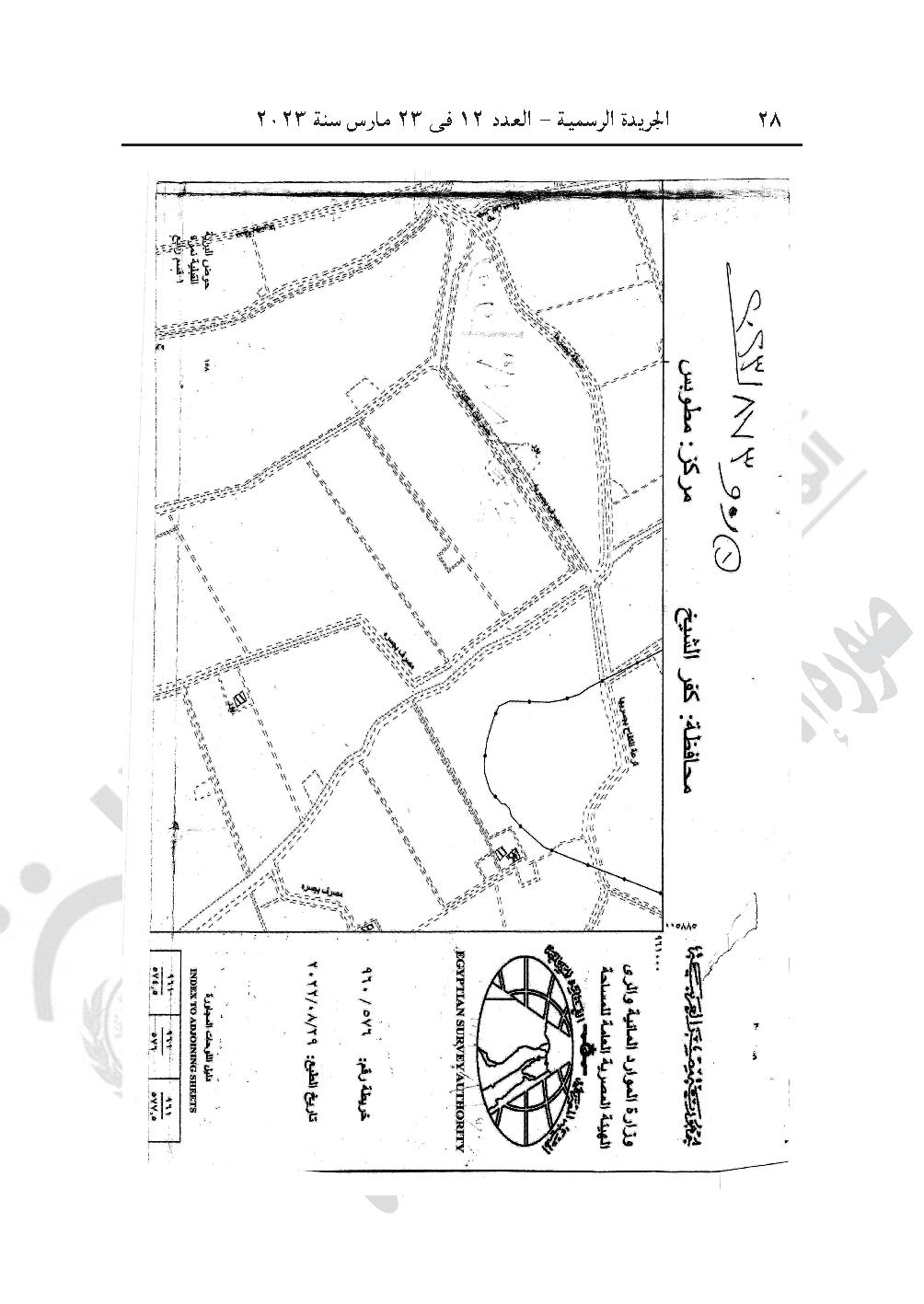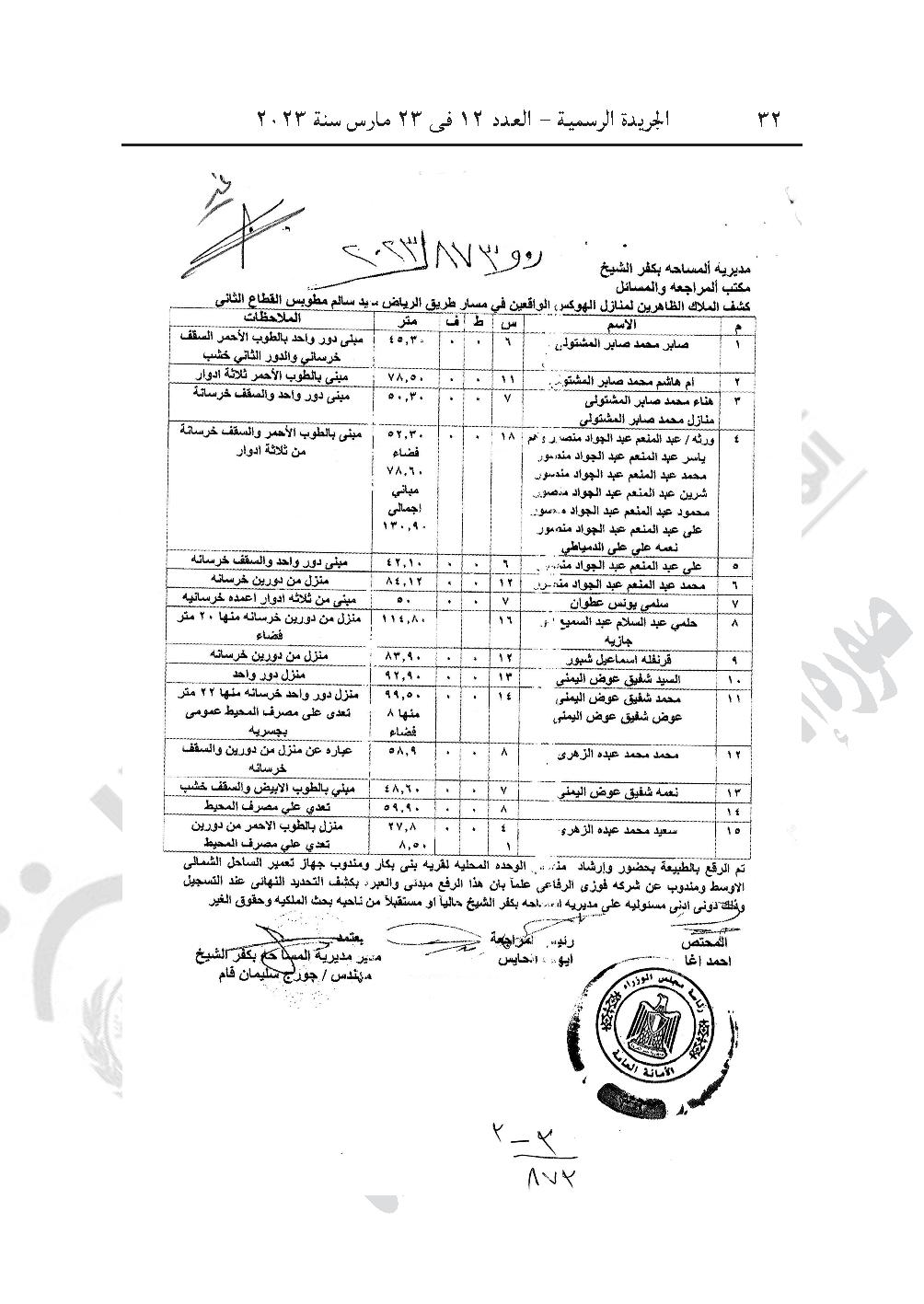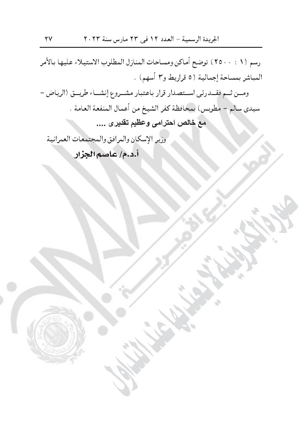 -قرار رئيس الوزراء رقم 874 لسنة 2023، باعتبار مشروع إقامة محطة معالجة الصرف الصحى بناحية منشأة عباس زمام كفر تيدة، مركز سيدى سالم، محافظة كفر الشيخ، والواقعة بحوض أم الدور الشرقية نمرة (2) ضمن القطع أرقام (ص ـ 230، 176، 177، 178، 179، 180، 181، ص ـ 174، ص ـ 175) بمسطح (5 أفدنة و3 قراريط و15 سهمًا)، وذلك لصالح الهيئة القومية لمياه الشرب والصرف الصحى من أعمال المنفعة العامة.