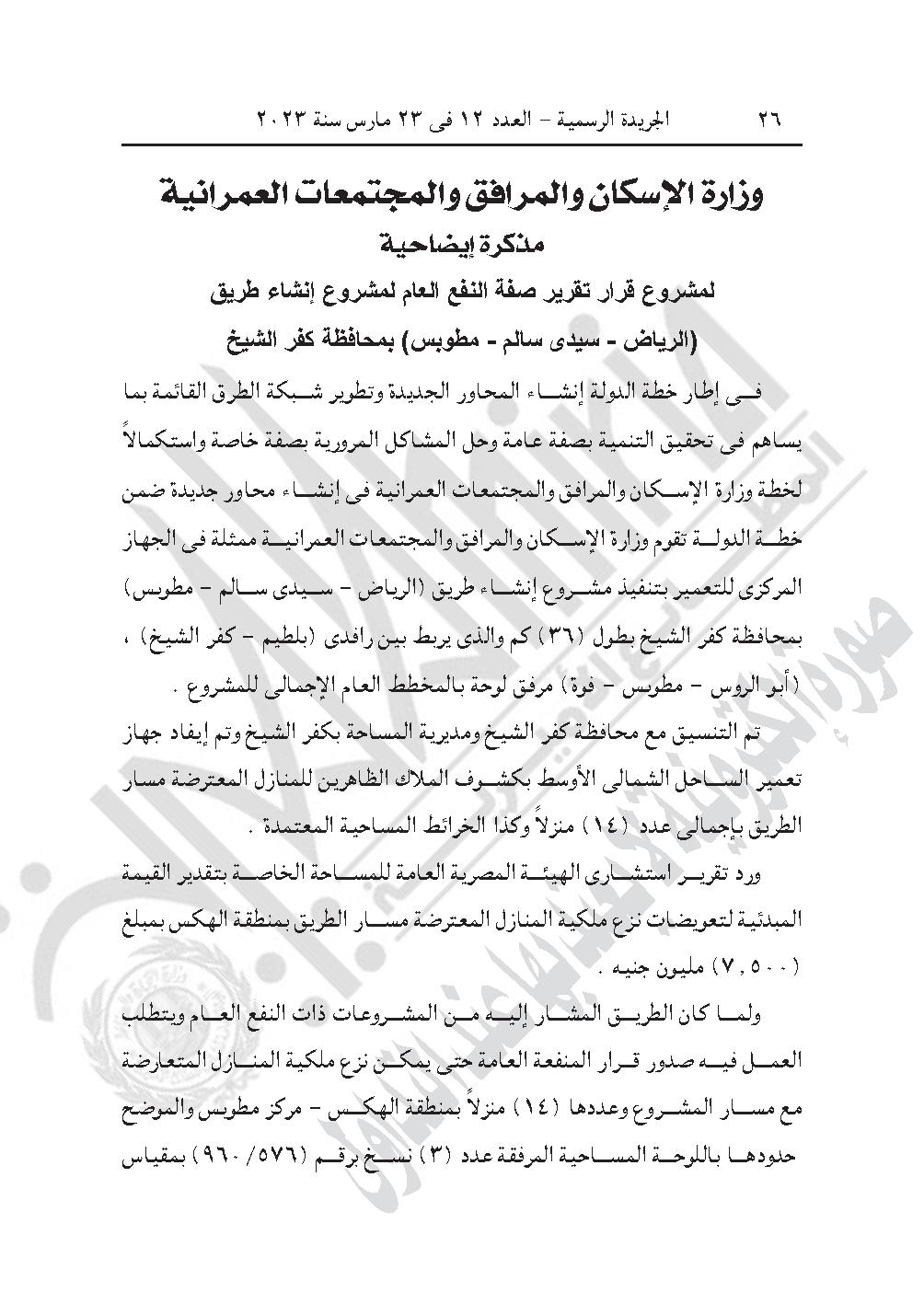 نشرت الجريدة الرسمية في عددها رقم 12، الصادر في 23 مارس 2023، 3 قرارات لرئيس الوزراء الدكتور مصطفى مدبولي، بشأن مشروع إنشاء طريق (الرياض- سيدى سالم- مطوبس)، وإقامة محطة معالجة الصرف الصحى بكفر الشيخ من أعمال المنفعة العامة. وتخصيص قطعة أرض من أملاك الدولة الخاصة لإقامة مدرسة إعدادية.