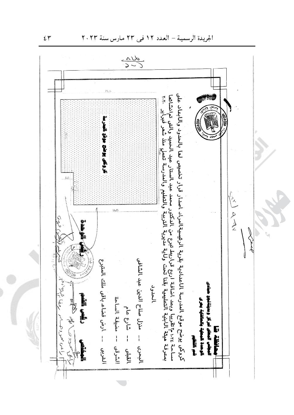-قرار رقم 967 لسنة 2023، 967 لسنة 2023 بتخصيص قطعة أرض من أملاك الدولة الخاصة بمساحة 1024 متر مربع (منها أربعة قراريط تبرع المواطن/ محمد عبد الستار عبد الحميد (ناحية قرية الرئيسية، زمام قرية الحلفاية بحرى، التابعة للوحدة المحلية لمركز ومدينة نجع حمادى، محافظة قنا، بالمجان، لصالح مديرية التربية والتعليم بالمحافظة، لإقامة مدرسة يوسف عبد الستار عبد الحميد الإعدادية عليها، وفقا للحدود والأبعاد المبينة بالرسم الكروكي المرفق.