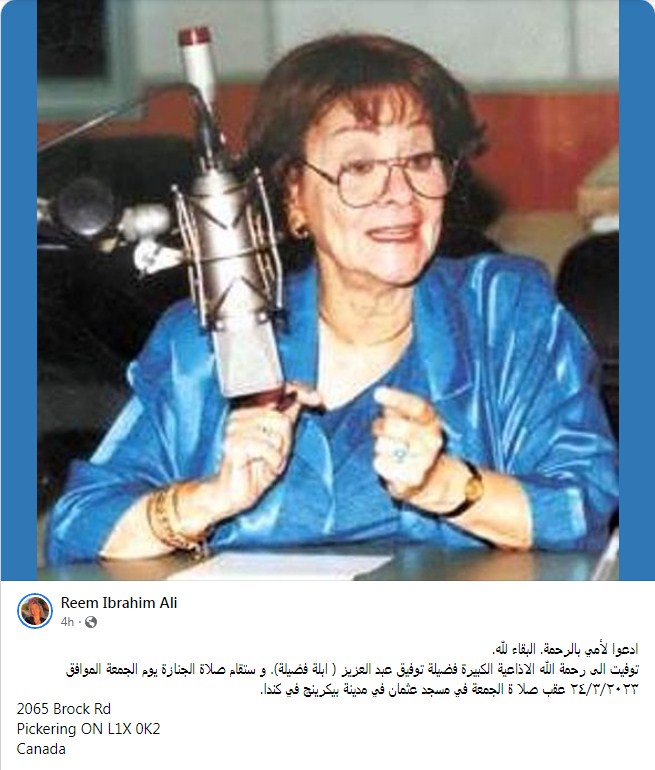 كلمات ريم إبراهيم، ابنة فضيلة توفيق، نزلت كالصاعقة على رؤوس محبي أبلة فضيلة، عندما أعلنت وفاة والدتها فقالت "ادعوا لأمي بالرحمة، البقاء لله، توفيت إلى رحمة الله الإذاعية الكبيرة فضيلة توفيق عبدالعزيز، أبلة فضيلة".