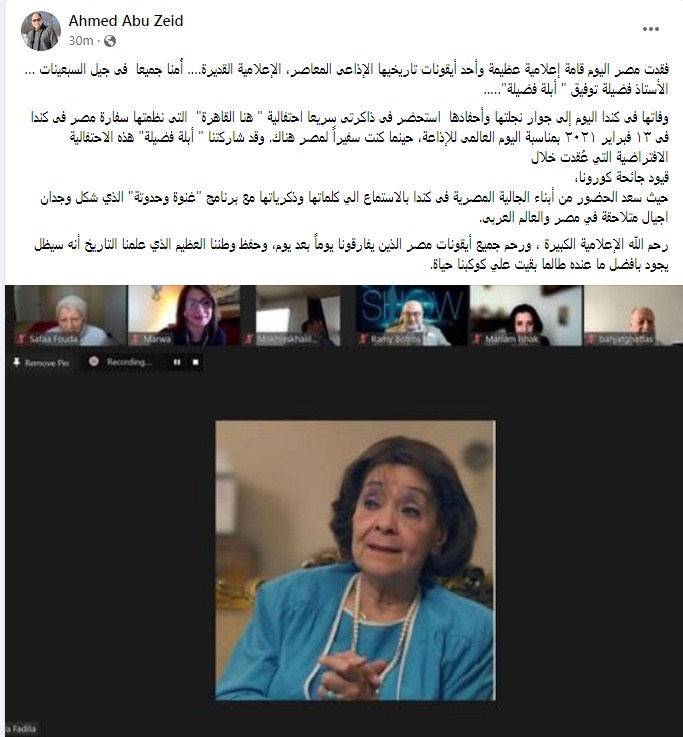 وعن ذكرياته مع أبلة فضيلة قال السفير أحمد أبو زيد "استحضر فى ذاكرتي سريعا احتفالية "هنا القاهرة"، التى نظمتها سفارة مصر فى كندا فى ١٣ فبراير ٢٠٢١ بمناسبة اليوم العالمي للإذاعة، حينما كنت سفيرًا لمصر هناك. وقد شاركتنا " أبلة فضيلة" هذه الاحتفالية الافتراضية التي عُقدت خلال قيود جائحة كورونا، حيث سعد الحضور من أبناء الجالية المصرية فى كندا بالاستماع إلى كلماتها وذكرياتها مع برنامج "غنوة وحدوتة" الذي شكل وجدان أجيال متلاحقة في مصر والعالم العربى."