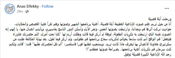أما وزير الإعلام السابق أنس الفقي فقال: "ورحلت أبلة فضيلة أنا من جيل تربى على صوت الإذاعية العظيمة أبلة فضيلة، أغنية برنامجها الشهير وصوتها وهي تقرأ علينا القصص والحكايات، حواديت تركت أثرها في وجداننا، وارتبطت بصوتها المميز".